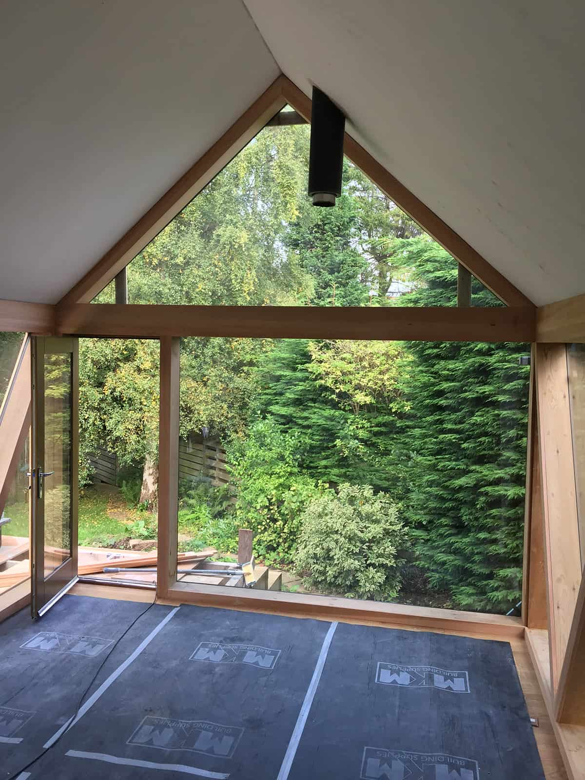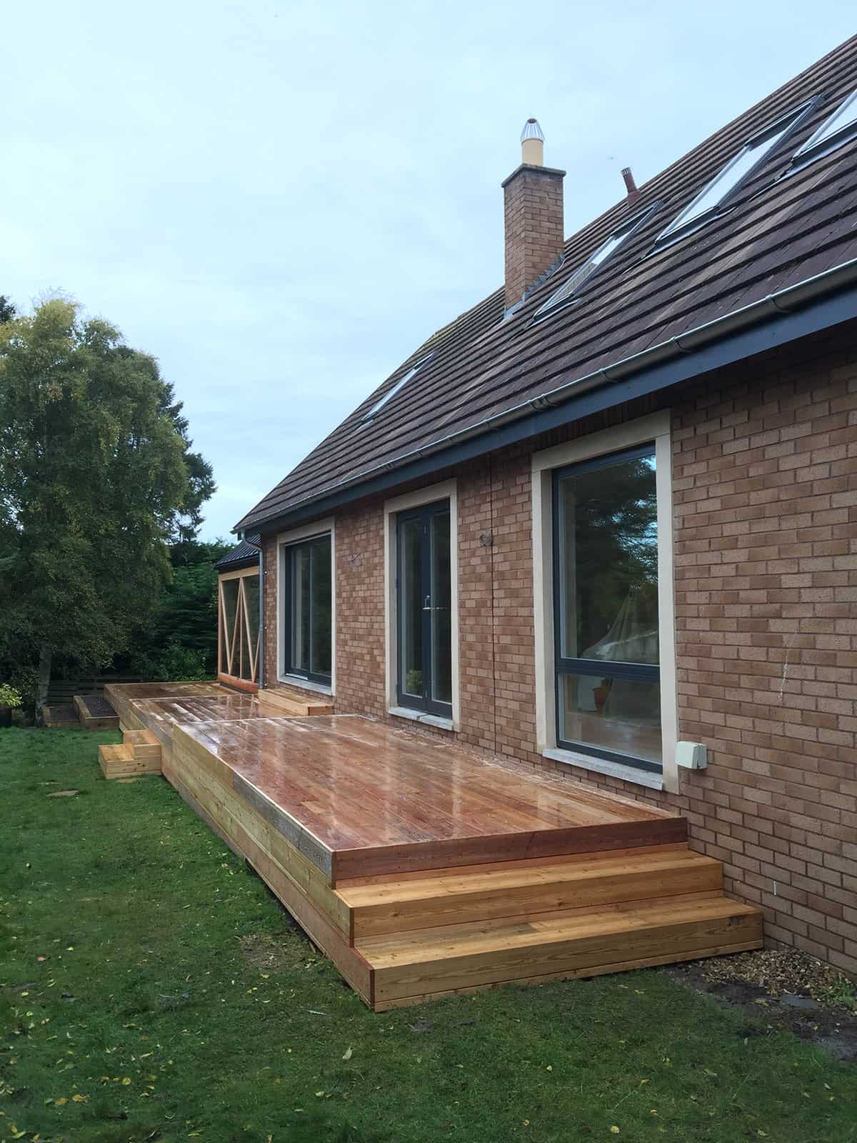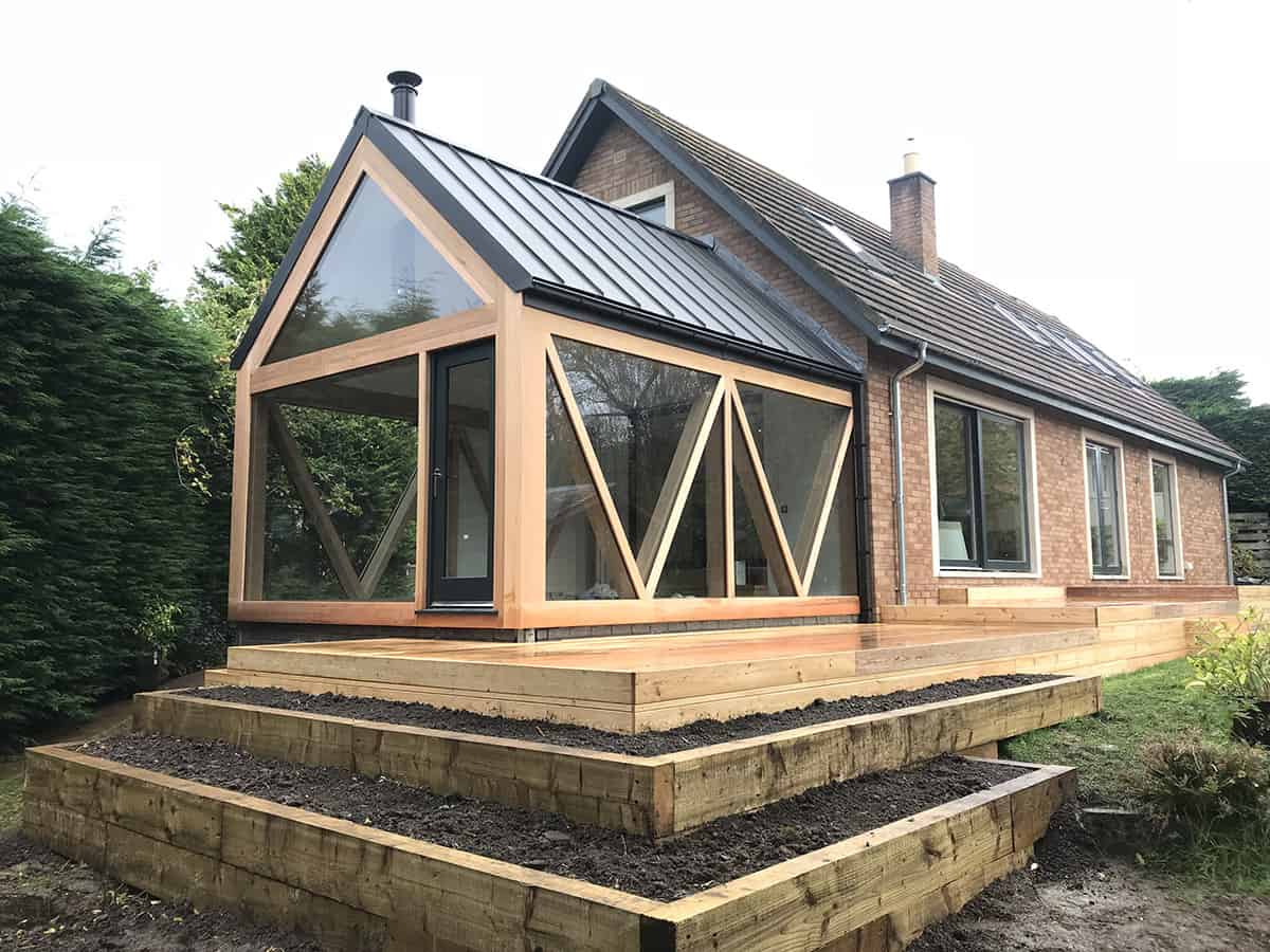 A beautiful contemporary extension designed by Konishi Gaffney. This garden room was built with large triangular sections of glass totally enclosed with cedar. It has a zinc roof and a large larch deck wrapping around the rear of the house and extension. New Aluminium clad windows were installed throughout the house along with new kitchen and utility.