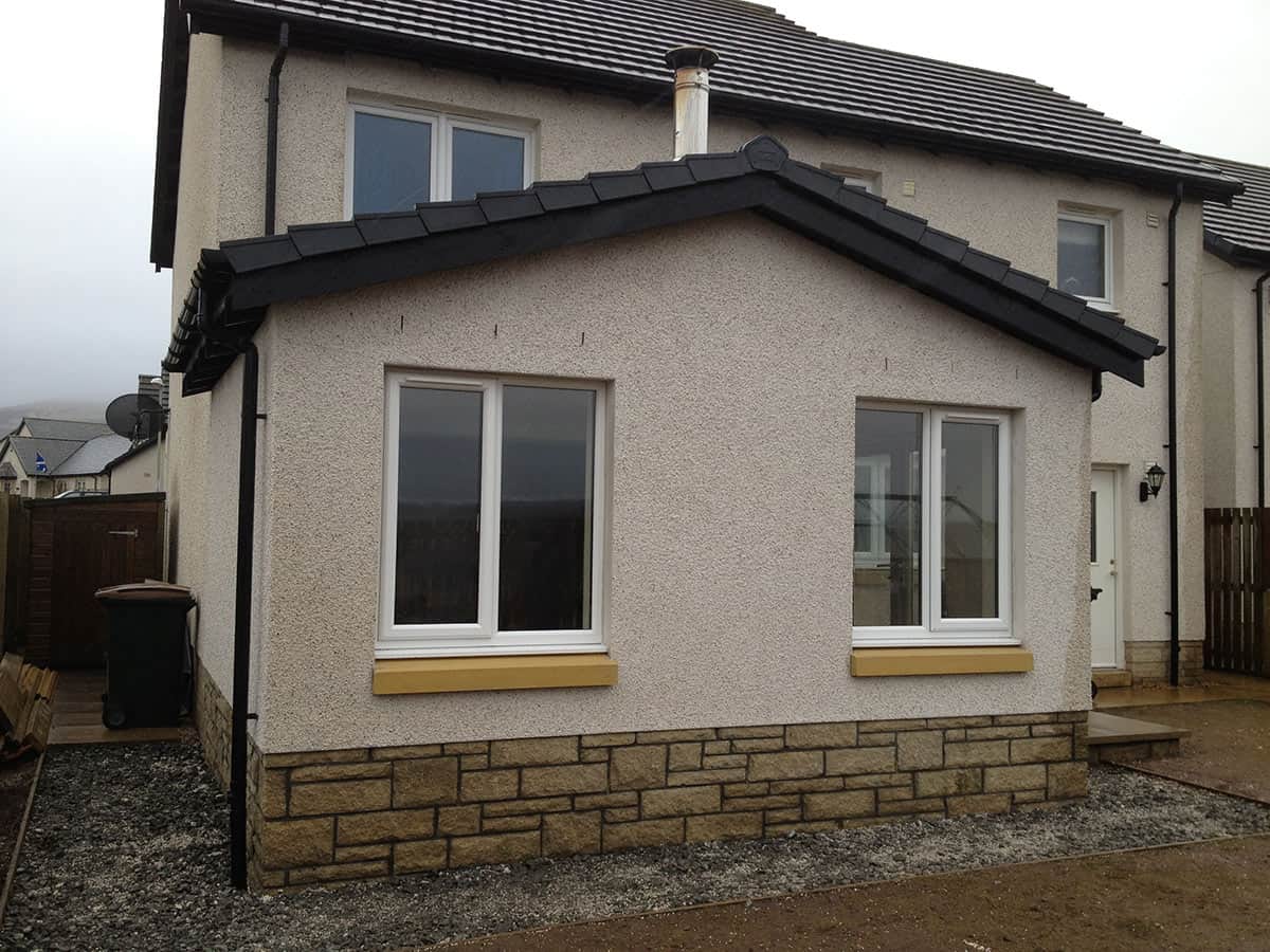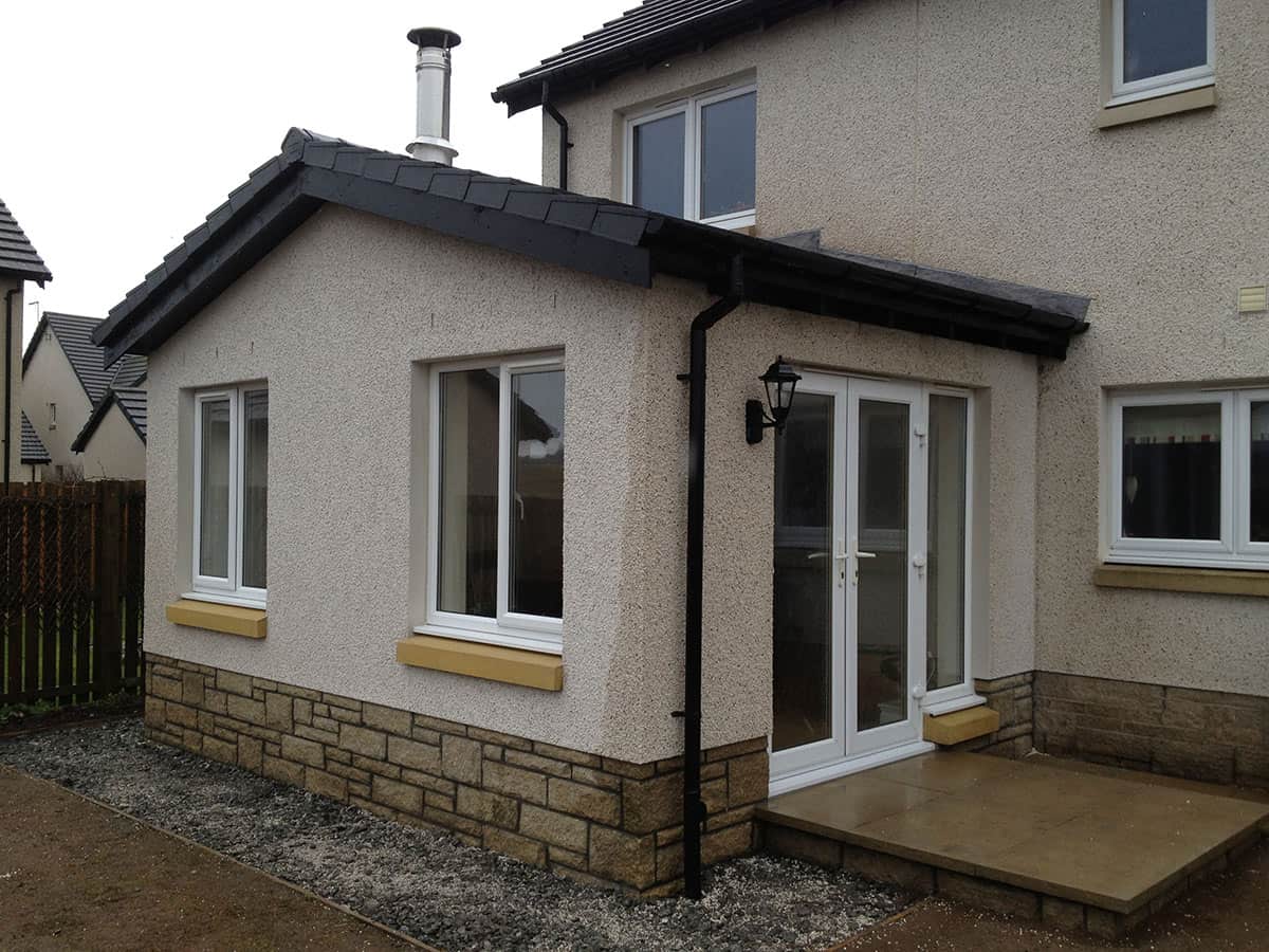 Typical of the traditional extensions found throughout Scotland with design features including slate roofs, well-proportioned rooms, render to the external façade & stone window sills. The doors and windows in this extension allow light to cascade throughout the house and this is complimented by the vaulted ceilings. As with many of our extension projects we design and build to give the appearance that this was part of the original design when the home was built. Additionally, our architect designed the extension allowing the existing views from the house towards the Ochil’s in the west to remain intact. To complement the extension, we installed a lovely log burning fire for those cosy winter nights.
